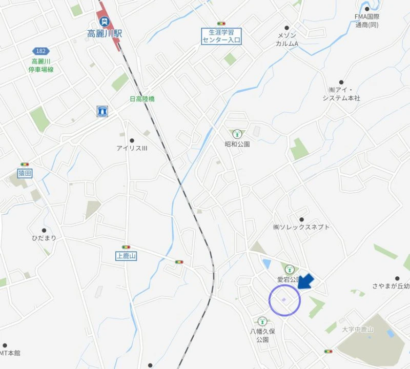 ※地図上の「対象地」は「埼玉県日高市大字中鹿山 」付近を示しています。実際の場所ではない場合がございます。詳しくはお問い合わせください。